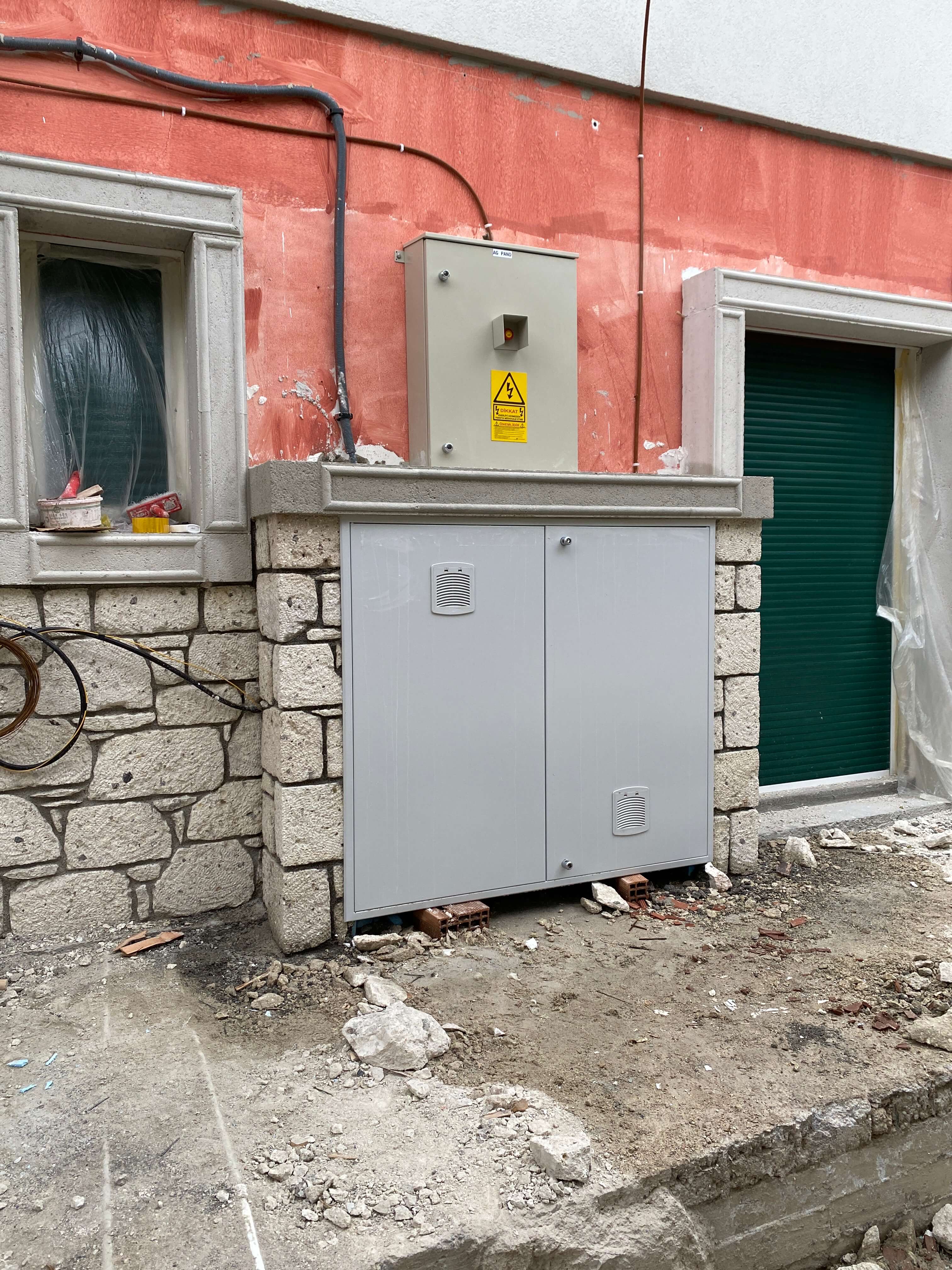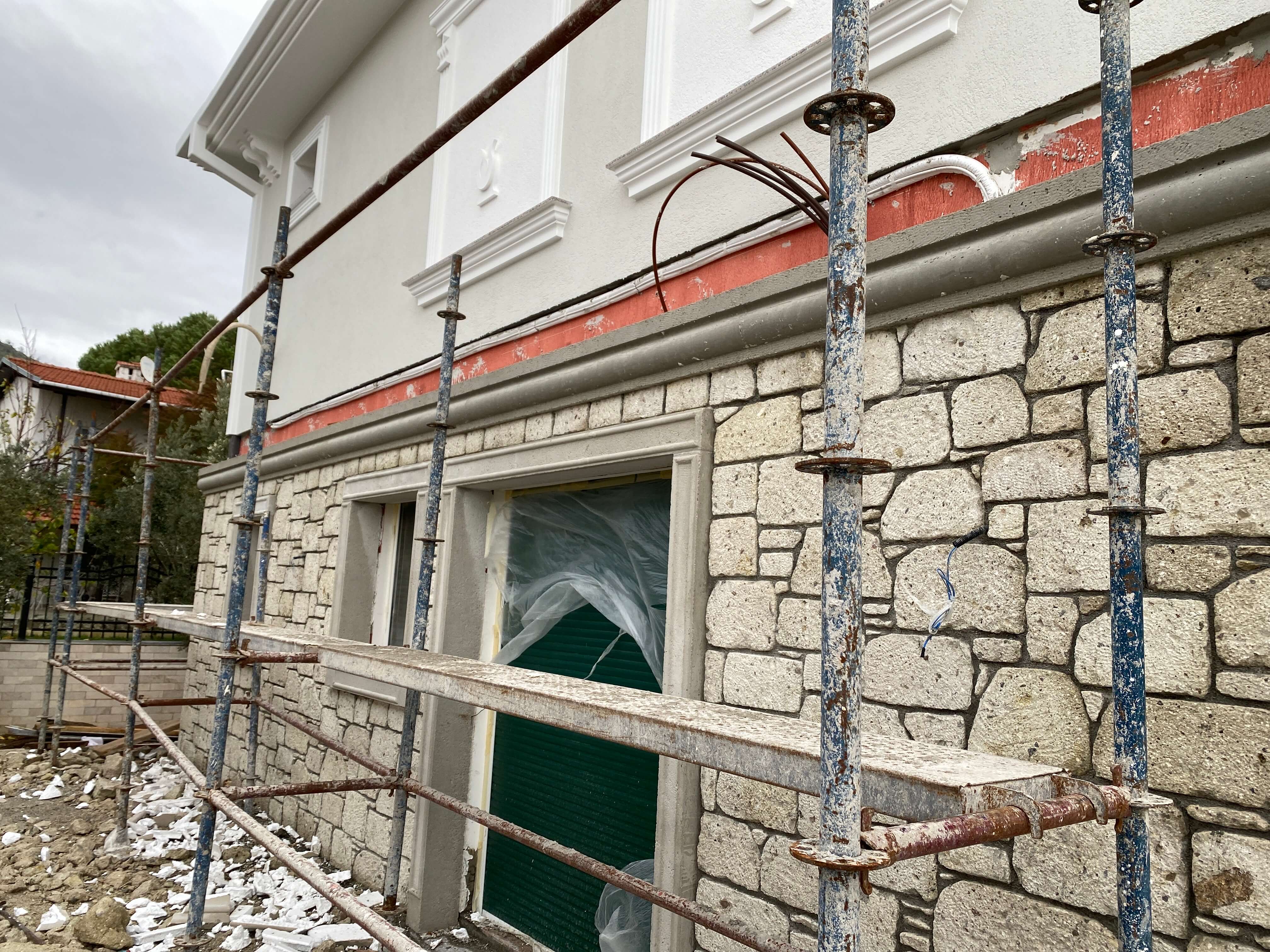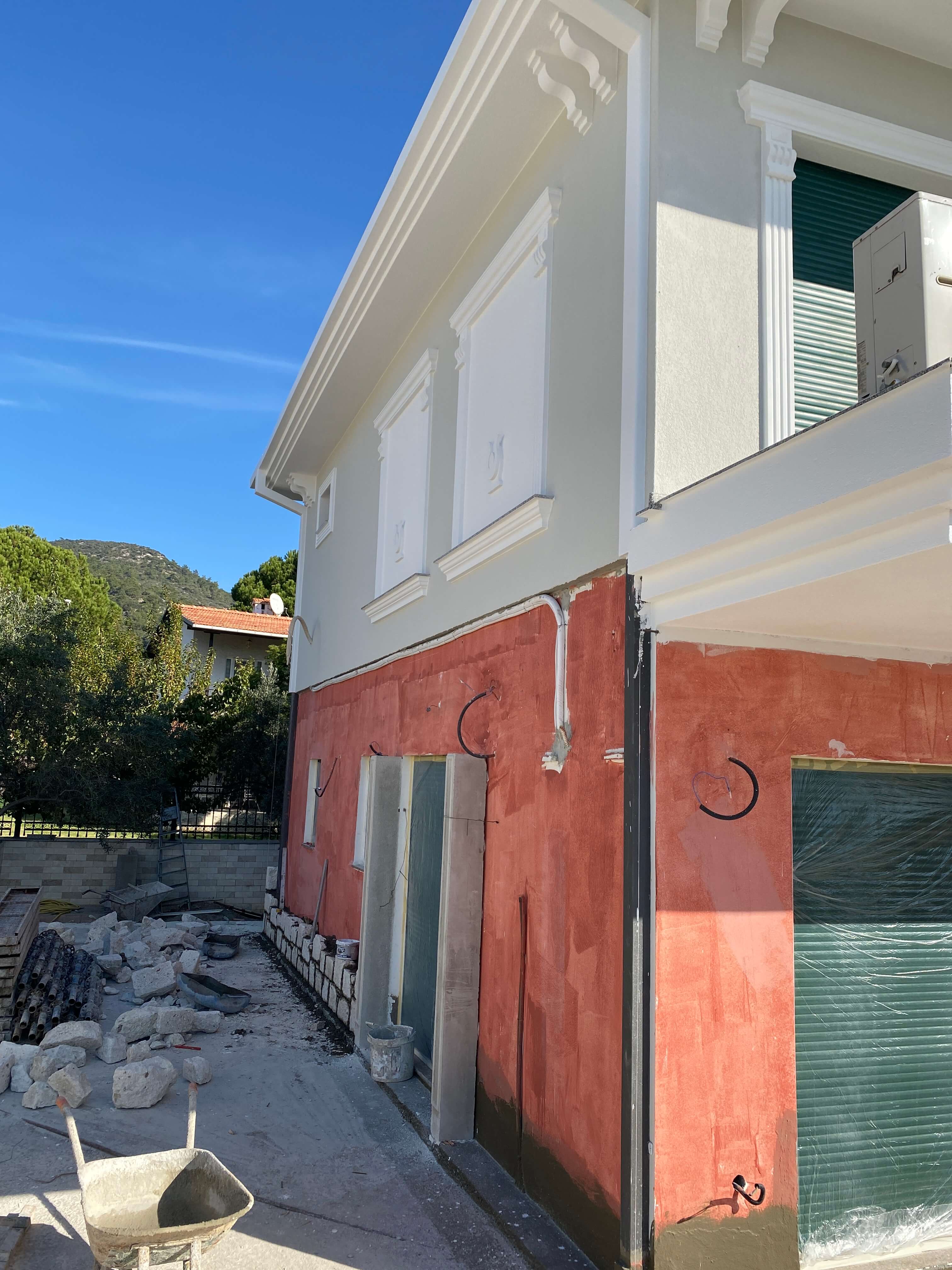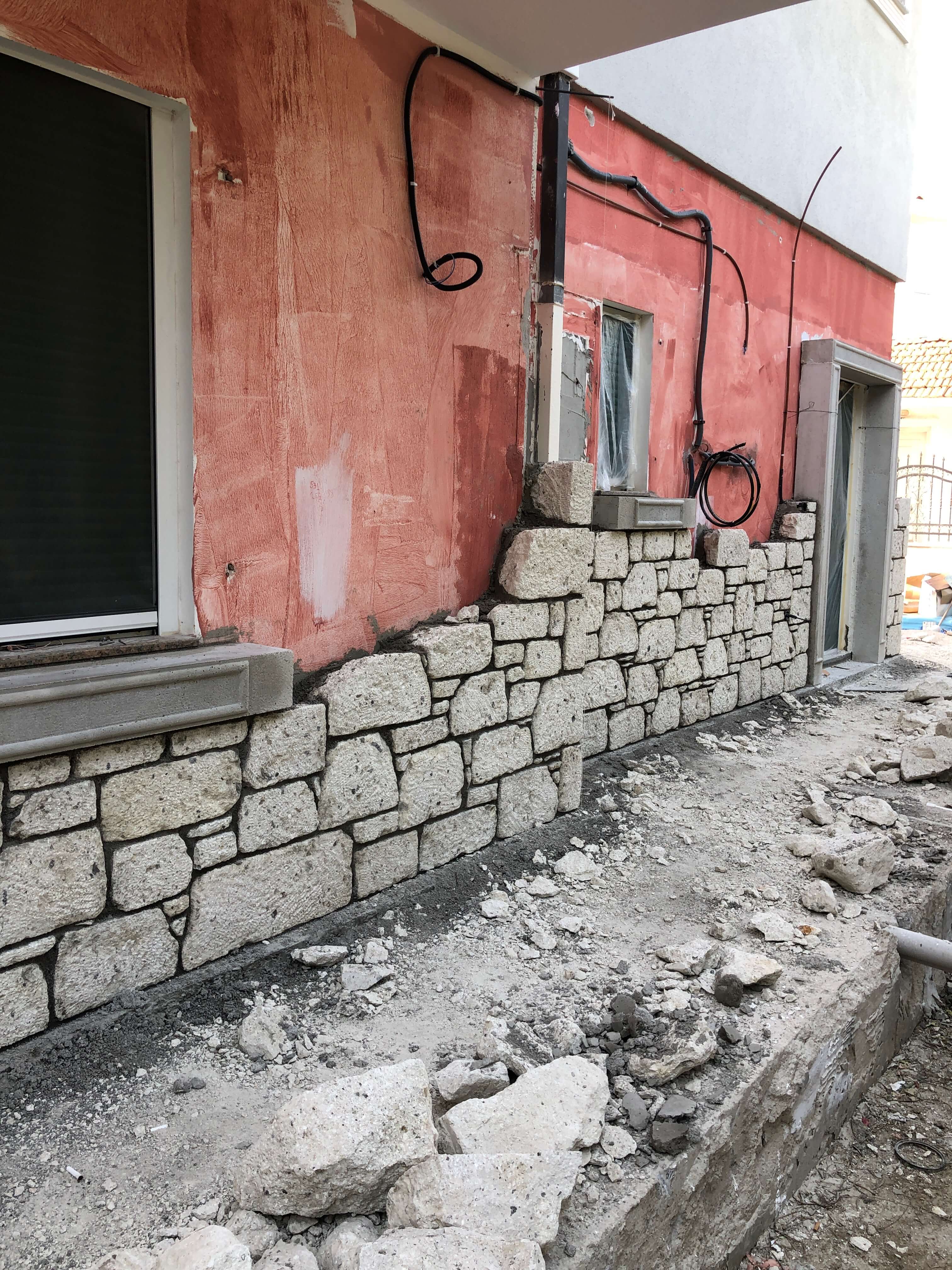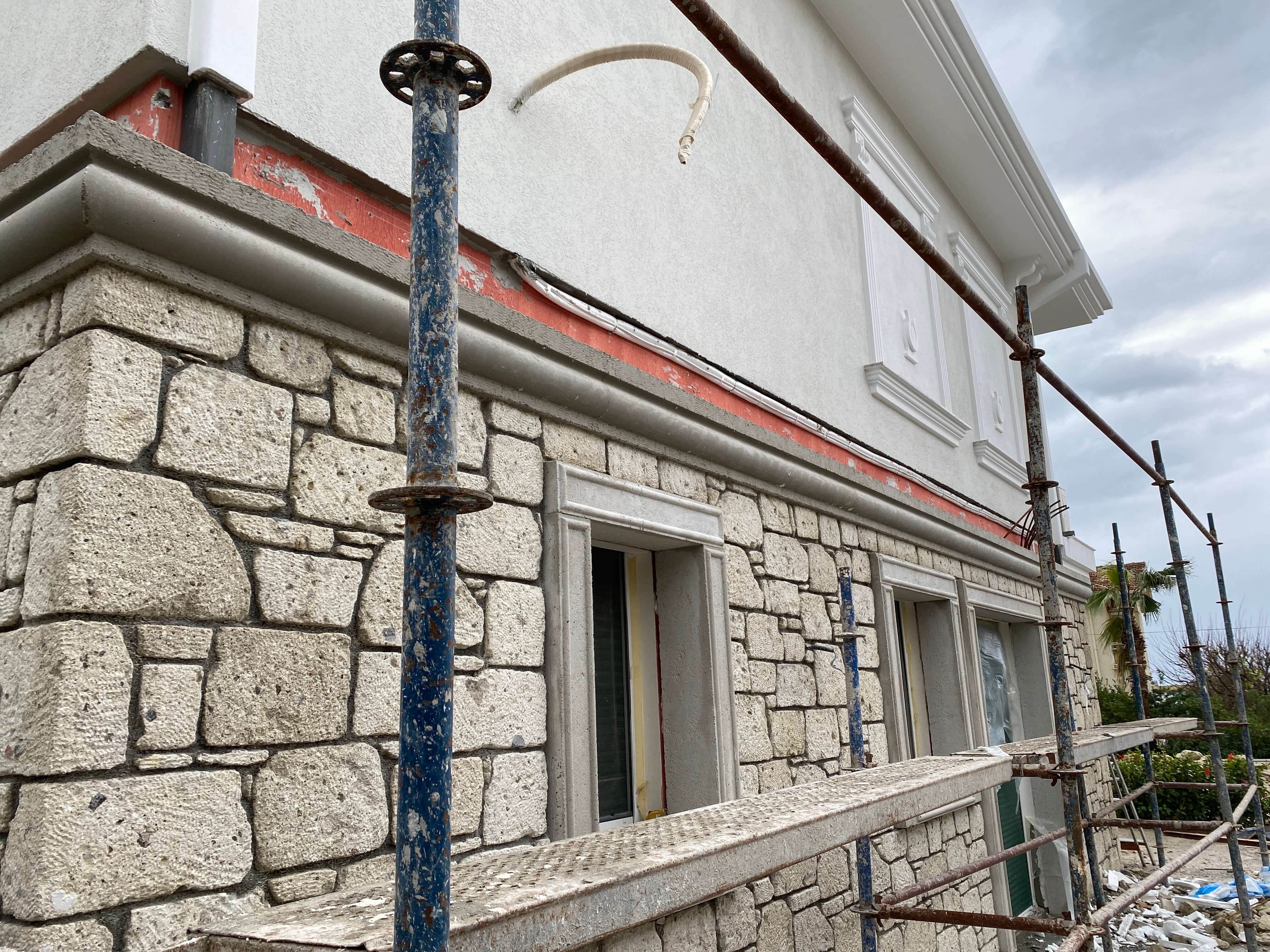 Bina dış cephesinde zemin katta Çeşme Alaçatı dan gelen taş ekibimizle birlikte alaçatı taşı uygulaması yapılmıştır. 18 cm kalınlıktaki taşın her bir tanesi elle yontularak işlenmektedir. 1. katta ise 5 cm kalınlıkta taşyünü ile mantolama yapıldıktan sonra süslemelerin ardından tüm cephe boyası yapılmıştır. Ayrıca iç hacimlerde rutubetler giderildikten sonra tüm iç hacimler boyanmıştır. Proje 7 ayda teslim edilmiştir.